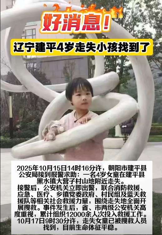 2025年10月15日14時(shí),當(dāng)“4歲女童走失”的警情從遼寧建平傳出,一場(chǎng)跨越地域與身份的愛(ài)心接力就此啟程,最終以“生命體征平穩(wěn)”的消息畫(huà)上圓滿句點(diǎn)。這不僅是一次搜救的成功,更是一幅“一方有難八方支援”的生動(dòng)畫(huà)卷。